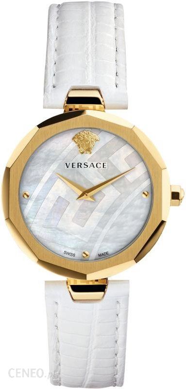 Zegarek damski Versace Idyia V17050017 posiada złotą kopertę ze stali szlachetnej i wisi na białym s