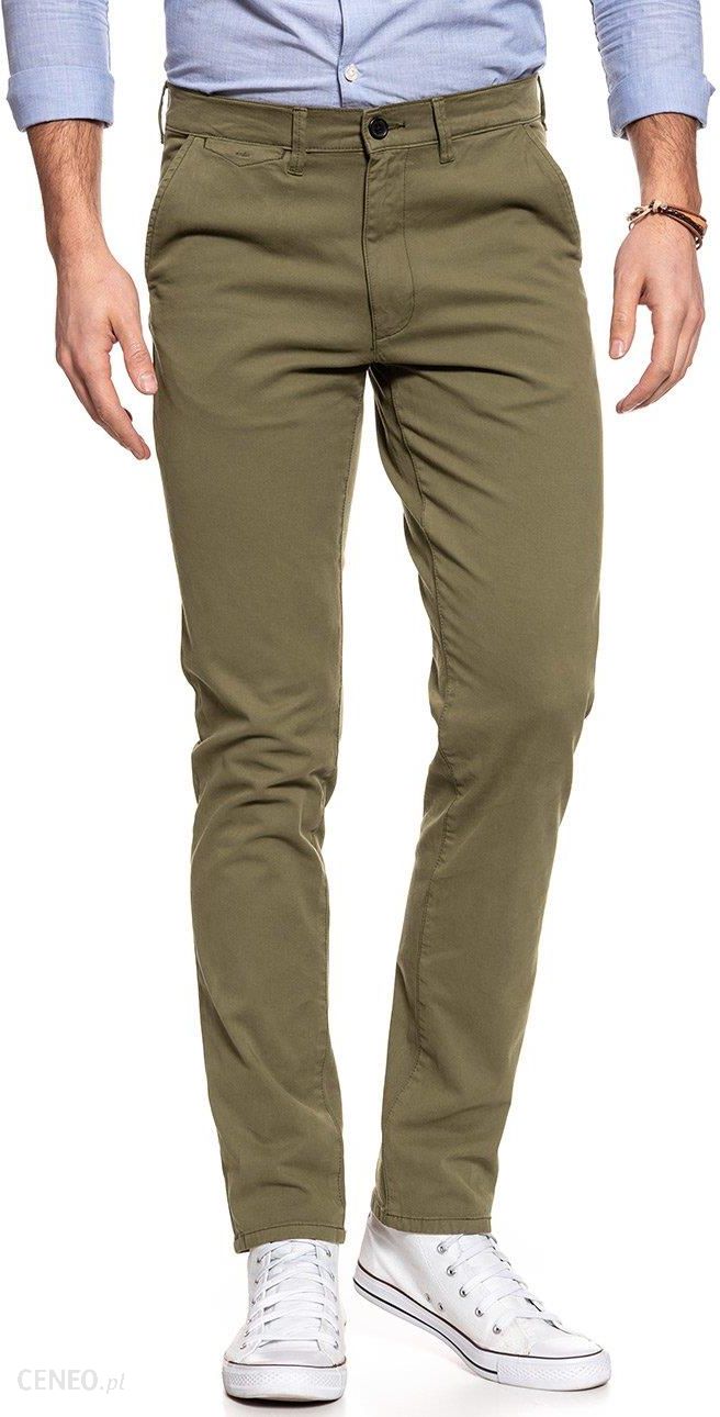 Męskie spodnie materiałowe w zielonym kolorze. Regularny krój, zwężane nogawki, zapięcie na zamek błyskawiczny. Tylne kieszonki zapinane na guziki. Nad prawą kieszonką naszywka z logo producenta.